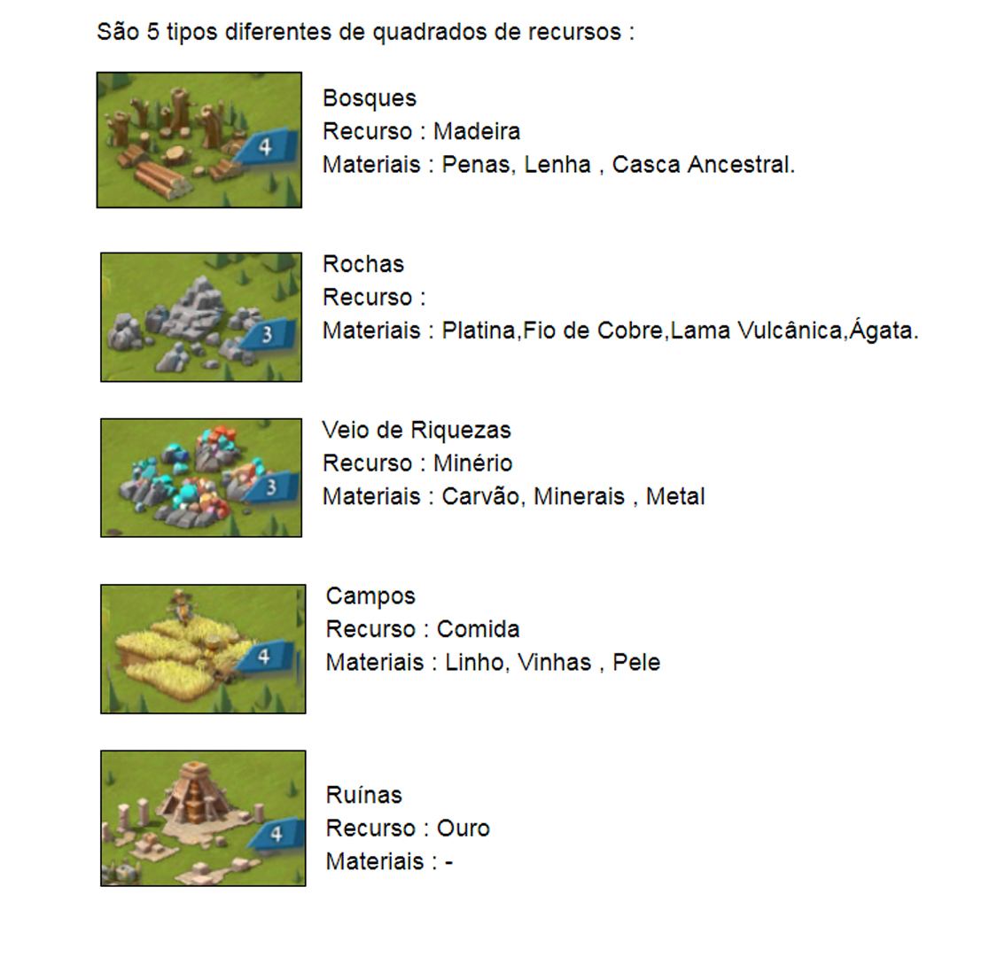 Você pode coletar recursos dos quadrados de recurso. Quadrados de recurso de nível mais alto permitem que você colete recursos mais rapidamente e podem dar materiais de melhor qualidade. Coleta será sua principal forma de juntar recursos no jogo. Isto porque os campos do seu reino não geram tanto e eles param de produzir quando a capacidade de armazenamento é atingida. Os materiais que você consegue ao coletar são extremamente importantes. Você precisará de muitos deles. Eles serão usados para forjar seus equipamentos.